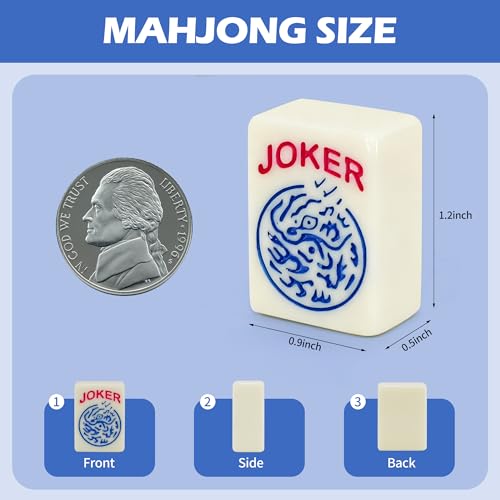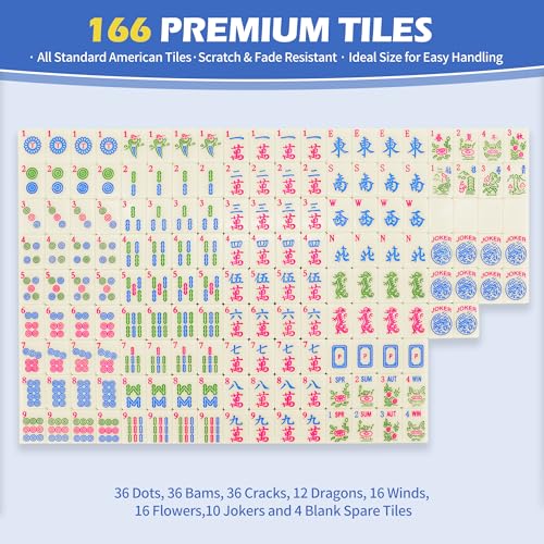 - 166 Premium Tiles: Our authentic American Mahjong Set includes all 166 standard tiles required for a proper game—36 Dots, 36 Bams, 36 Cracks, 12 Dragons, 16 Winds, 16 Flowers, 10 Jokers, and 4 blank spares—each meticulously sized at 1.2” × 0.9” × 0.5” for easy handling and shuffling. Say goodbye to the frustration of hunting for missing tiles between rounds