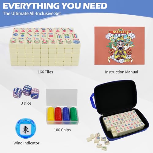 - The Ultimate All-Inclusive Game Night Package:Why buy extra accessories? This American Mahjong Set comes fully loaded with everything you need to start playing right away—no trips to the store required!You get 3 durable dice for setting the initial tile layout, 100 scoring chips for tracking points, a wind indicator to manage player order, and a clear instruction manual with easy-to-follow diagrams