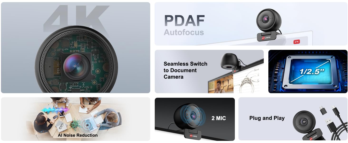 【PDAF Auto-Focus & Automatic Light Adjustment】This PC webcam features Phase Detection Autofocus (PDAF), which tracks subjects from 0.65 to 10 feet for blur-free 4K video. It also includes Auto Exposure technology: this adjusts color temperature and compensates for low light, delivering studio-grade imaging even in dim settings.