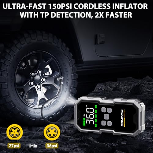 ➤【SMART DIGITAL TIRE INFLATION FUNCTION】The BSMOOM jump starter battery pack features an LED smart screen and advanced tire pressure detection, providing crucial information such as battery level, inflation mode, and real-time tire pressure. Supporting four units (PSI, BAR, KPA, KG/CM), the 150PSI air compressor efficiently inflates a normal car tire to 20PSI in about one minute, making it easy to use and highly convenient.