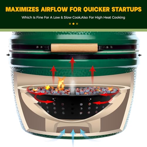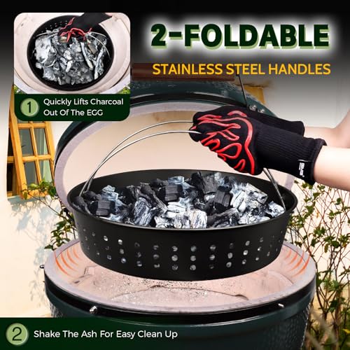 - 【CHARCOAL BASKET WITH FOLDABLE HANDLE】The two convenient handles to quickly lifts charcoal out of the green egg,and provide an easy way to shake out the cool ash to maximize airflow for quicker startups.