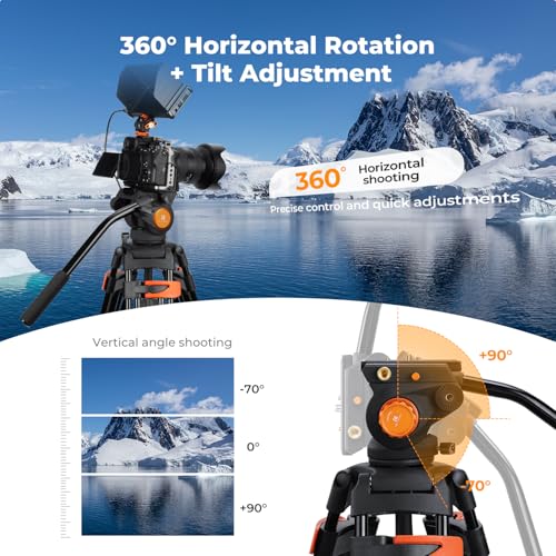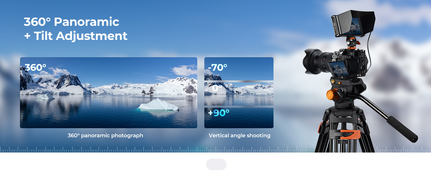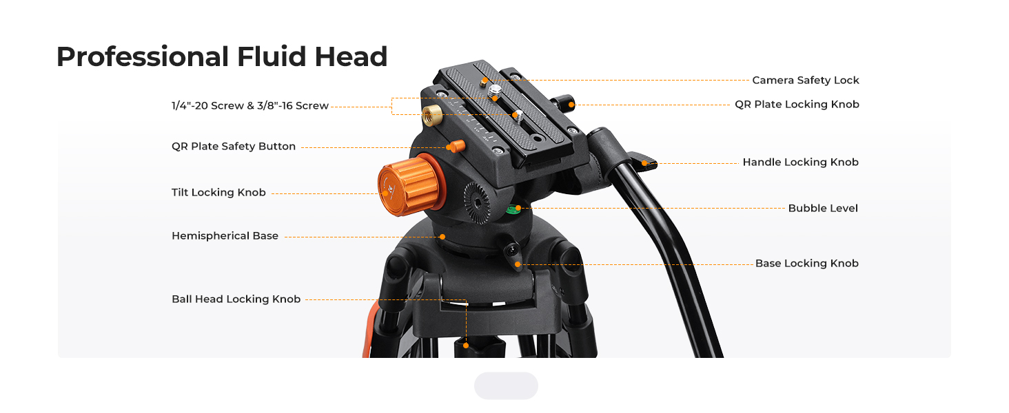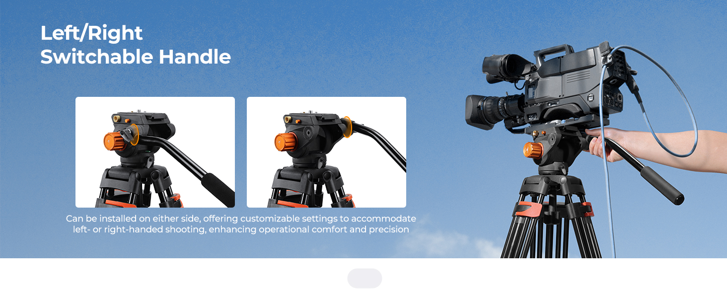 【Fluid Head】This fluid head supports 360° horizontal pan and -70°/+90° vertical tilt, enabling diverse shooting angles and providing video creators with stable footage. Also includes detachable handle for a different dominant hand.