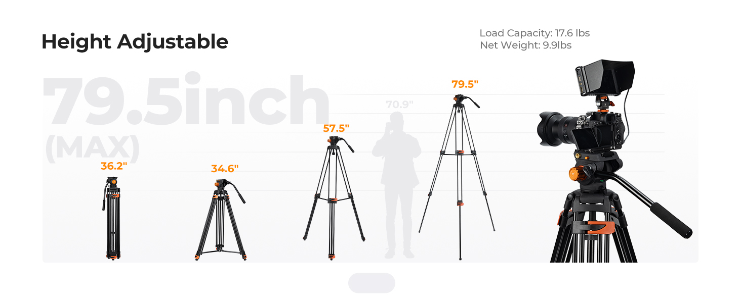 【Height Adjustment & Easy Portability】3 section telescopic legs and flip locks enable this shooting tripod to extend from 34.6" to 79.5". The tripod can be folded to 36.2" and fit in the carrying bag for easy storage and transportation.