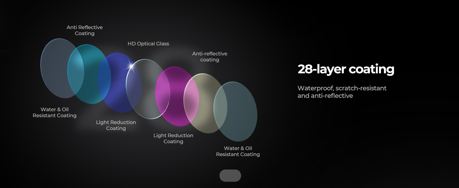 【28-Layer Nano Coating for Superior Clarity & Durability】Built with high-definition optical glass and 28-layer nano coating, including anti-reflection, water-repellent, and scratch-resistant layers. This ensures vivid colors, reduced glare, easy cleaning, and long-lasting performance.