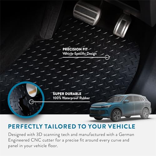 PERFECTLY TAILORED TO YOUR VEHICLE: Designed with 3D scanning tech and manufactured with a German Engineered CNC cutter for a precise fit around every curve and panel in your vehicle floor. Each mat lies completely flat and features model specific clips to match your floor fixings (where applicable) to stop movement and keep your mats secured in place