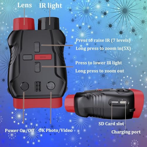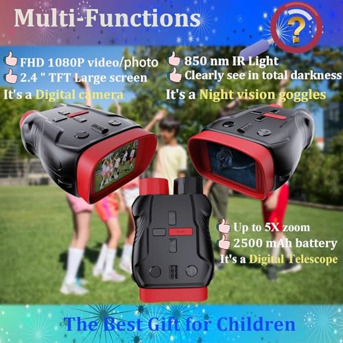 2.4'' Large HD Display: Night vision goggles for kids equiped with a 2.4" large TFT LCD screen, allowing kids to view crystal-clear photos and videos. 25mm objective aperture and 5x digital zoom of view offer you more full field.