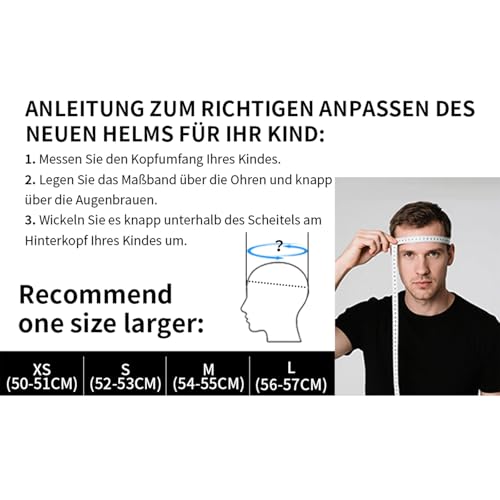 - About size-: XS code 50-51CM, S code is 52-53CM, M code is 54-55CM, L code is 56-57CM – please read the size measurement scheme on the picture carefully (very important).Measure the circumference of the largest part of the child's head, (usually just above the eyebrows) in cm: Use a paper tape measure or a string and do not pull it too tight, loose like a hat would fit.