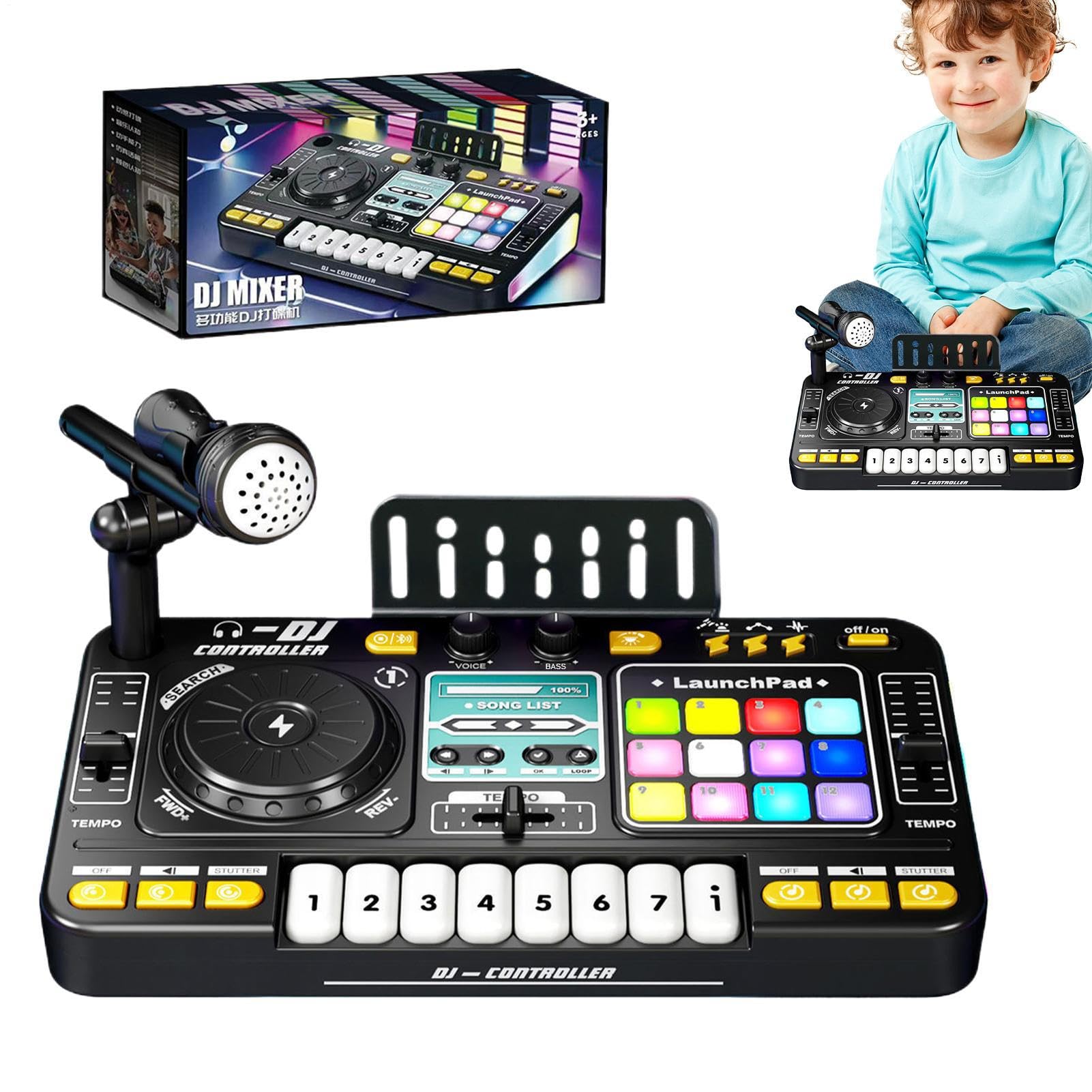 Kids DJ Mixer Table, Interactive Music Keyboard Toy with Microphone, Bluetooths, Piano Keys, LED Lights, Educational Musical DJ Set, Portable USB Charging Table Keyboard for Boy Girl