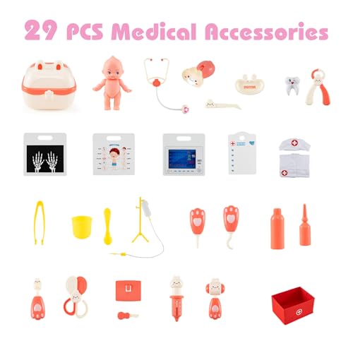 - Rich Accessories: The medical station contains 29 accessories that allow child to perform role-playing activities, such as auscultation, tooth extraction, injections and phlebos. Kids can independently invent further play scenarios, experiencing the joy of becoming “little doctors”.