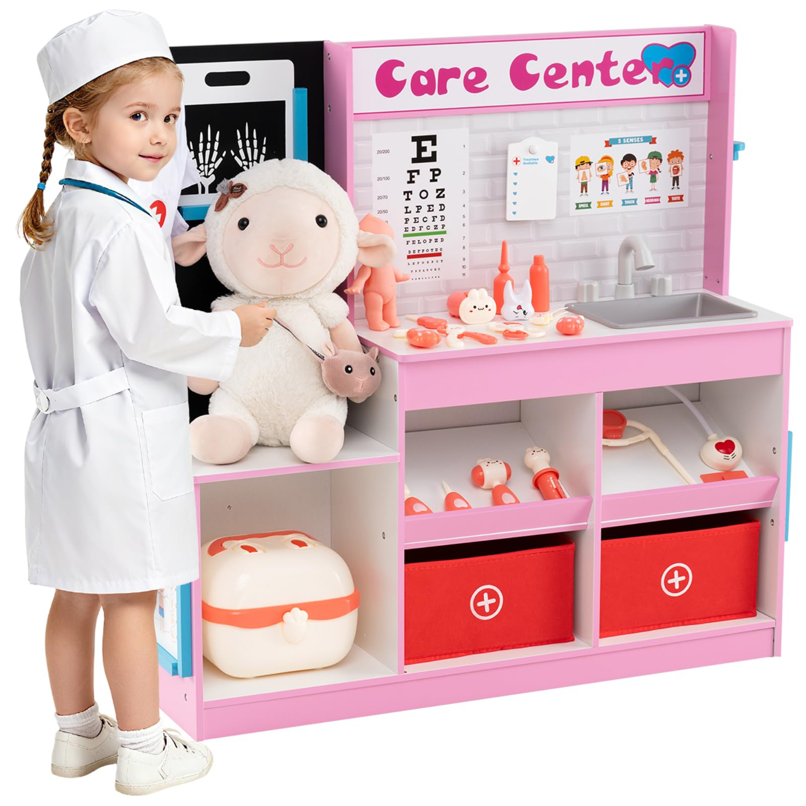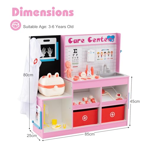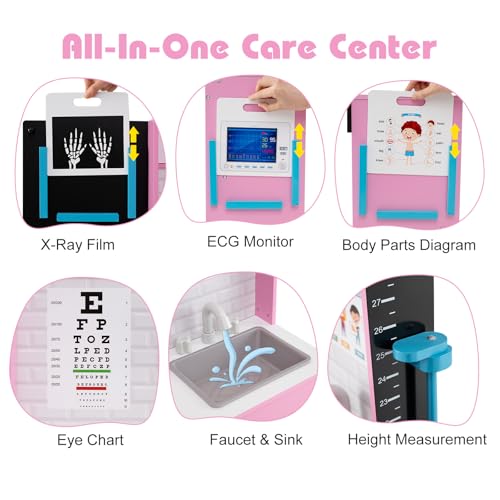 Kids Doctor Playset, Pretend Medical Station with Examine Region, X-Ray Film, ECG Monitor, Eye Chart, Height Measurer, Role Play Hospital Play Set Wooden Doctor Sets for 3+ Years Old (Pink)