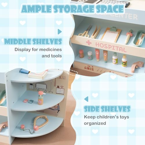 - Abundant Storage Space: Featuring multiple open shelves, this pretend play doctor kit offers ample storage for all included accessories. The convenient shelving ensures easy access and organization, encouraging children to care for their pretend medical tools.