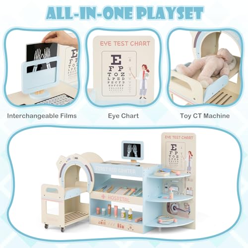 - Realistic Medical Center Playset: The doctor play set features a toy CT machine with a rotary screen and interchangeable films, allowing children to engage in imaginative diagnostic play. An eye chart adds to the realistic clinic atmosphere, inspiring kid's curiosity about medical professions in a fun and educational way.