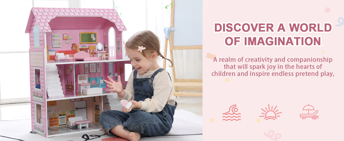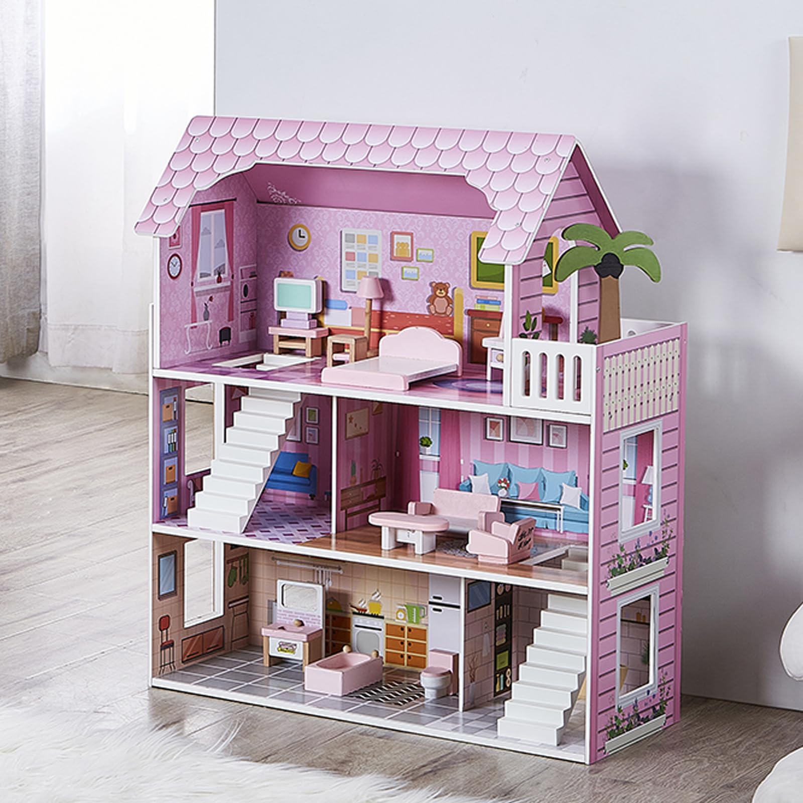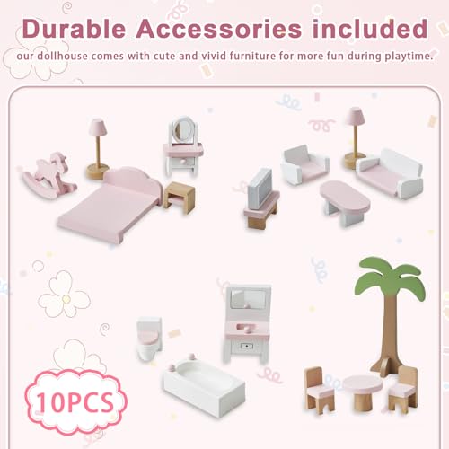 Kids Dollhouse – Pink Wooden Doll House with 10-Piece Mini
