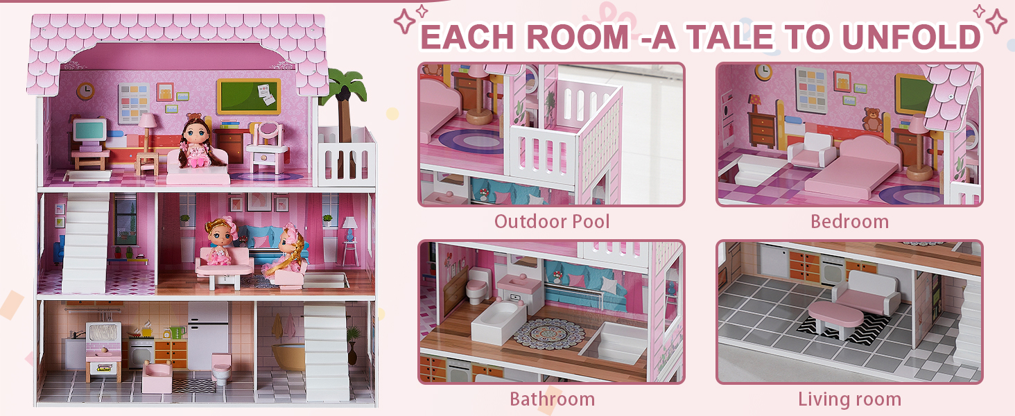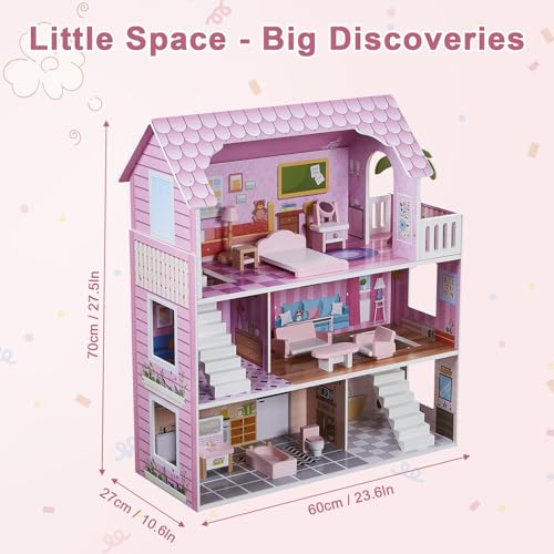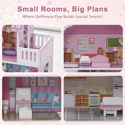 ✨ PINK WOODEN PLAYHOUSE: This wooden dollhouse (27.6"x10.7"x23.6") features 3-story dollhouse with 5 open rooms & balcony, includes 10-piece mini furniture (bed, table, chairs,stair and so on) to create their dream modern doll house. The semi-open design mimics real-life layouts, fostering creativity for ages 3+.