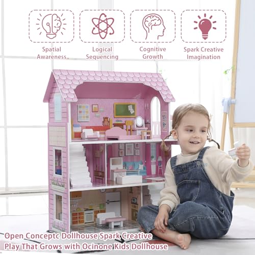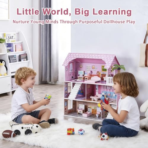 Kids Dollhouse – Pink Wooden Doll House with 10-Piece Mini Furniture Set, 3-Story & 5 Open Rooms, Easy to Assemble Pretend Play House, Gift for Girls Boys Ages 3 4 5 6 Years Old