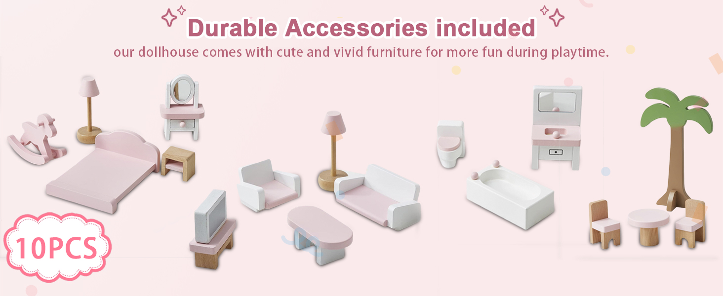 10-PIECE MINI FURNITURE SET: From dllhouse body to 10 pcs accessories, every detail sparks imagination. The 10-pcs mini furniture accessories are meticulously designed to resemble real items. Kids will love role-playing in this modern doll house with lifelike details. the semi-open design provides easy access, so that children can easily reach into each floor, rearrange furniture, and interact with their dolls.