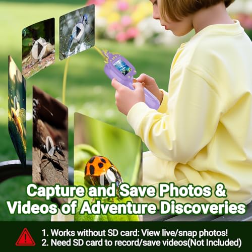 Ultra HD Exploration: Kids borescope snake camera toy with light, equipped with a 2.4-inch 1080P HD Screen. Featuring a 60° viewing angle, 180° image rotation, and 3x zoom function, it allows children to clearly observe fine details of ants, spiderwebs, bug, or tree bark day or night. Instantly capture and save photos and videos of discoveries via an SD card (sold separately). Ready to use right out of the box—no phone, WiFi, or app required.