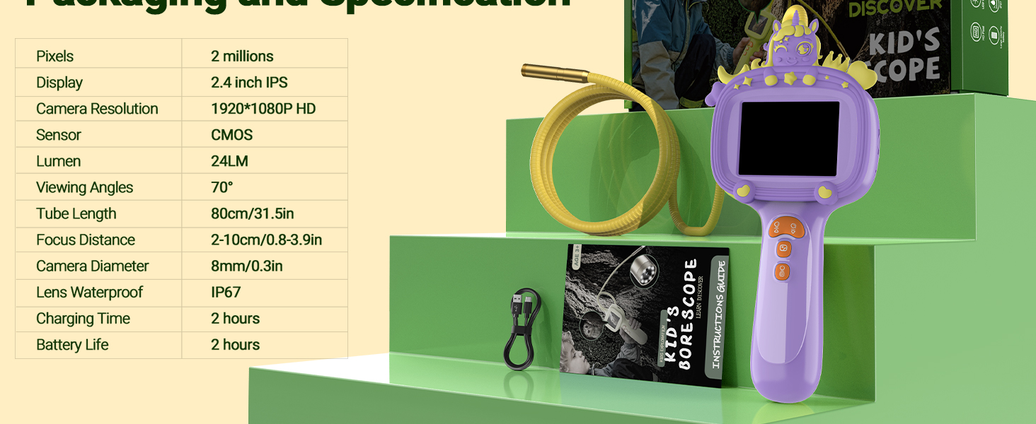 Wireless & Portable: The handheld unicorn-shaped kids explorer endoscope kit features a built-in 650mAh rechargeable battery. With a modern Type-C port, it offers up to 2 hours of wireless operation per charge and can be used while charging for uninterrupted exploration. No need to worry about power when away from outlets or outdoors. The lightweight, ergonomic grip supports one-handed use and easy portability. Note: The Type-C cable is for charging only and does not support data transfer.