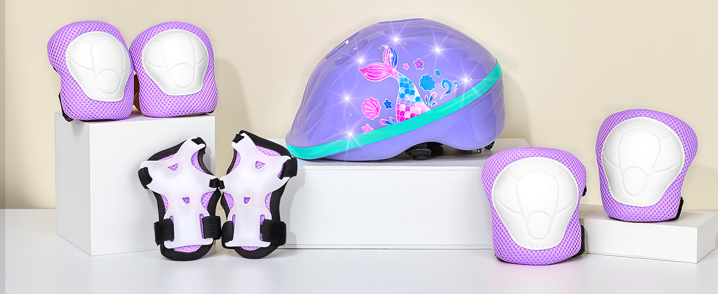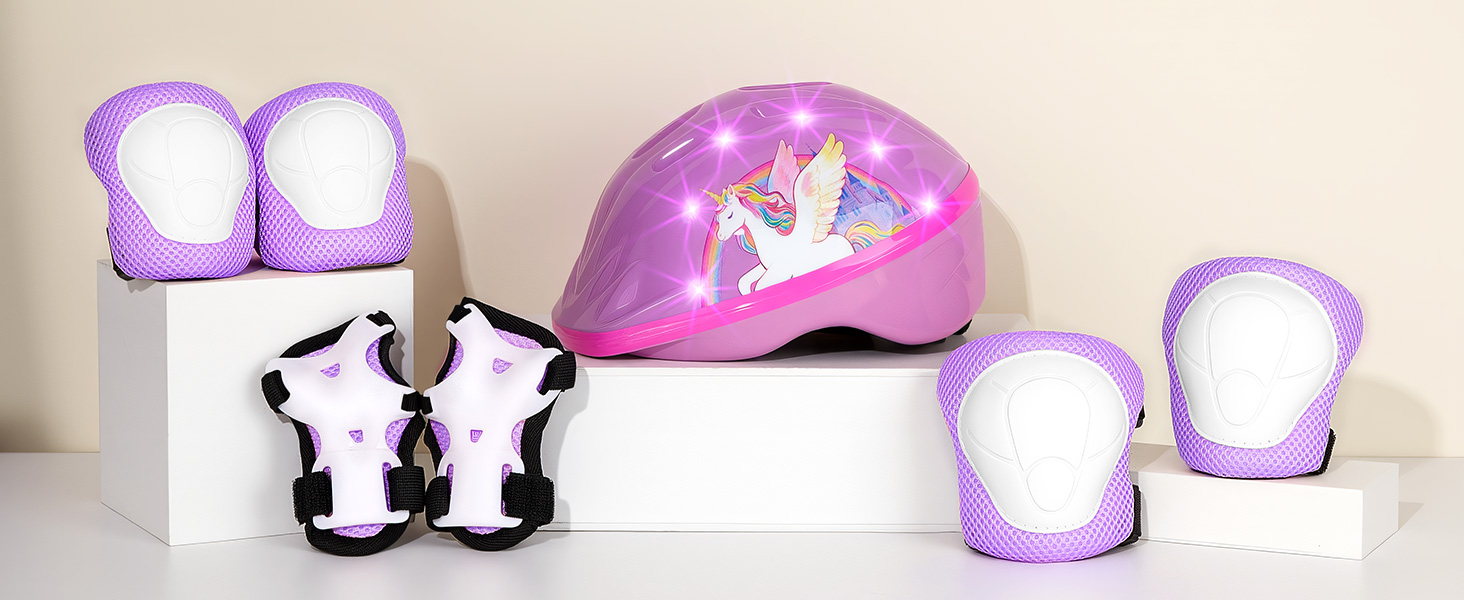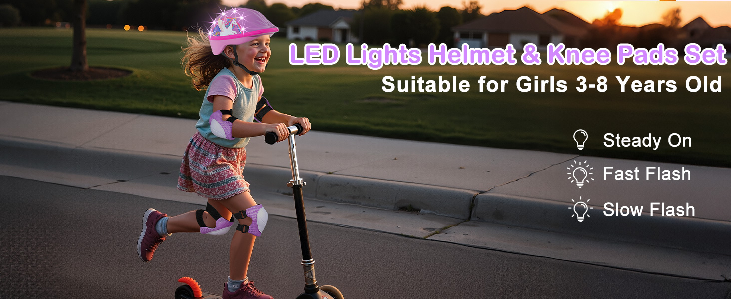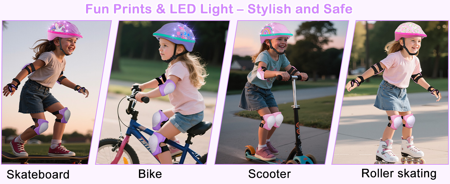 Ideal Present: Our girls helmet designed with cute prints and LED lights for added fun, it's sure to make your kids the star wherever they go; The helmet and knee pads for kids are suitable for biking, skating, scootering, the drswstring mesh bag makes it easy to take anywhere; Make your child's birthday or Christmas special with this cool bicycle helmet pads set