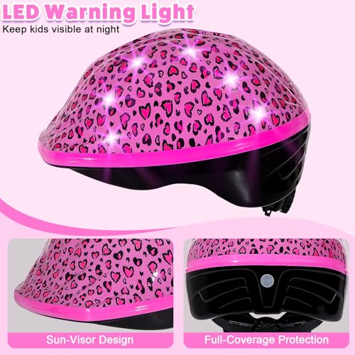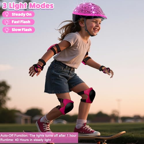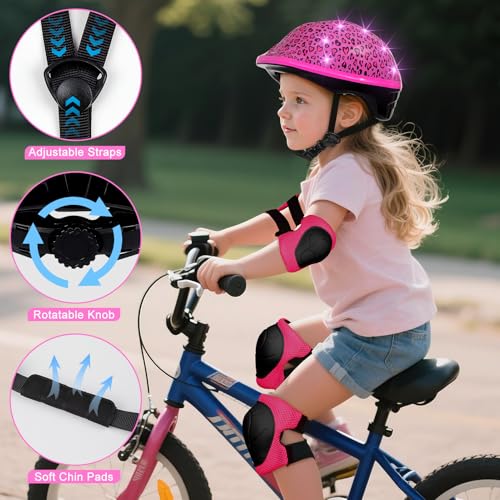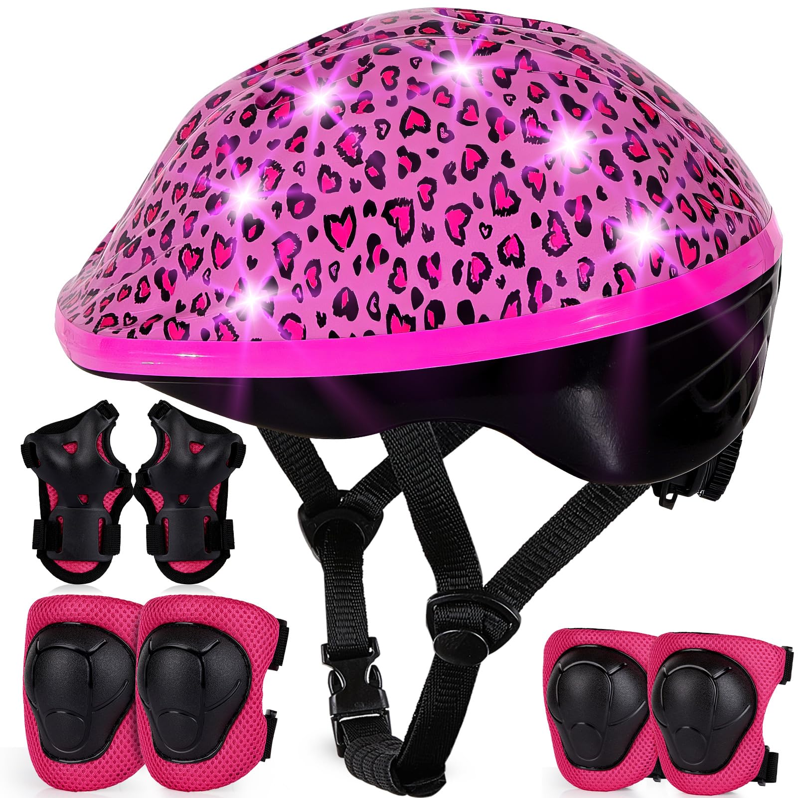 Kids Helmet and Pads Set Age 3-5-8, Girls Bike Helmet with LED Lights, Adjustable Knee Pads and Elbow Pads Toddler Protective Gear Set for Children Cycle, Skateboard Scooter, Roller Skates