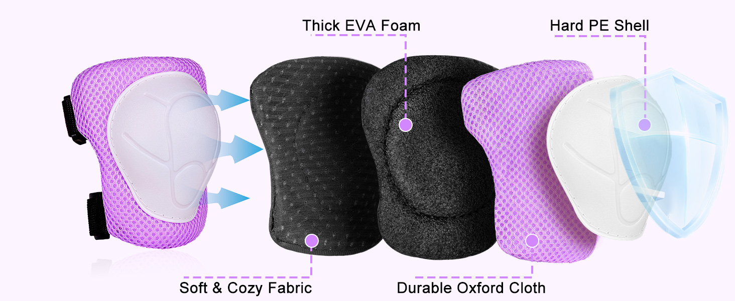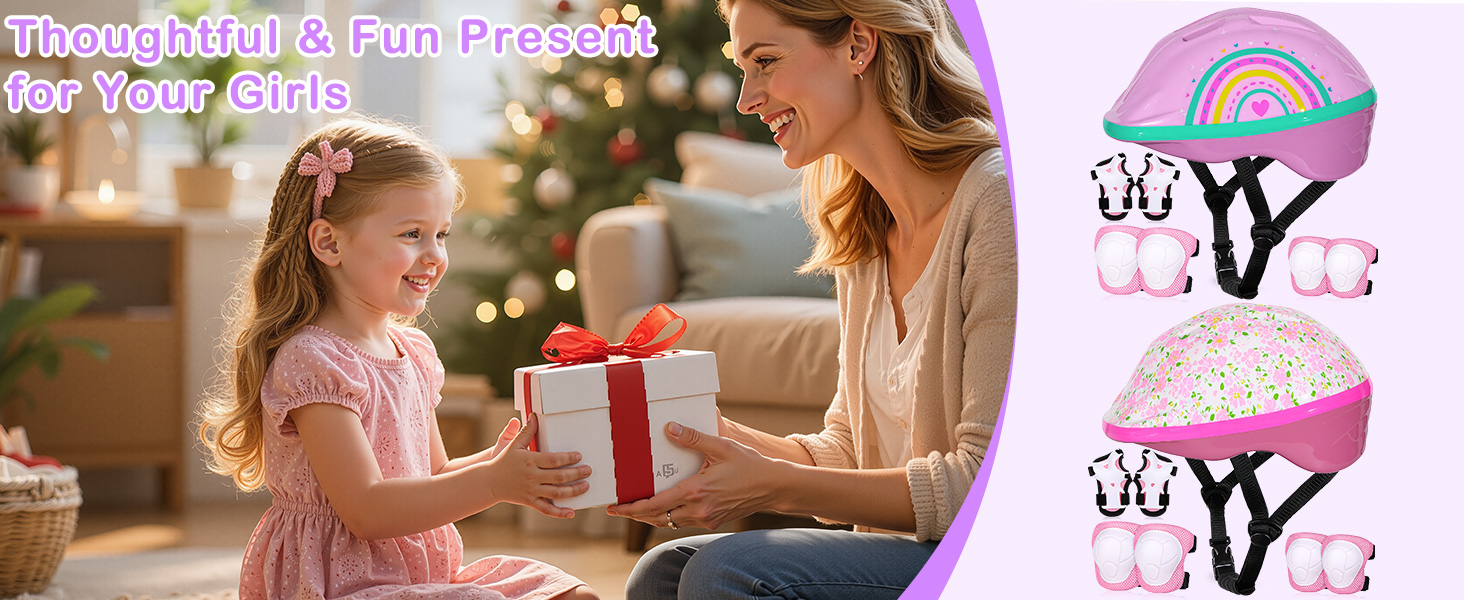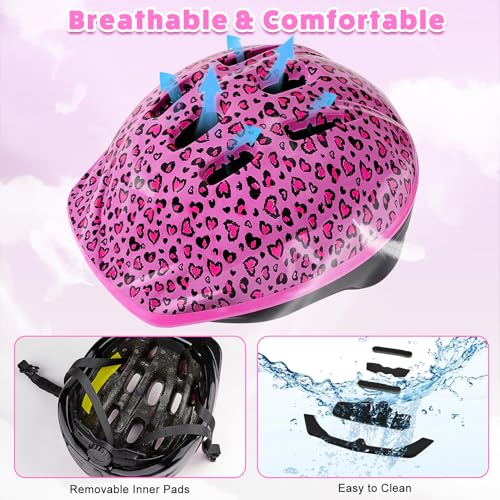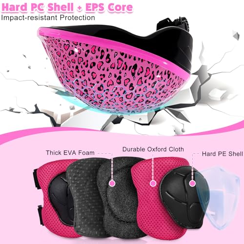 Adjustable Design to Grows with Kids: This girls bike helmet is fully adjustable to ensure a secure fit for growing kids 3-8 years; You can turn the rotatable knob to adjust the head circumference from 48-53cm (18.9-20.9 inch), secure the adjustable strap for a snug fit; The elastic straps on the kids knee pads and elbow pads set allow this hekmet knee pads set to grow with your child