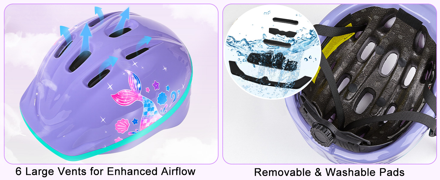 Safety Meets Comfort: The lightweight and ventilated helmet for kids 3-5-8, features 6 top air vents to keep your child's head cool and dry, reducing sweating and avoid overheating, let kids play for hours; The helmet brim protects kids' eyes from strong sun, while the soft, removable and breathable inner padding offers easy cleaning for fresh wear