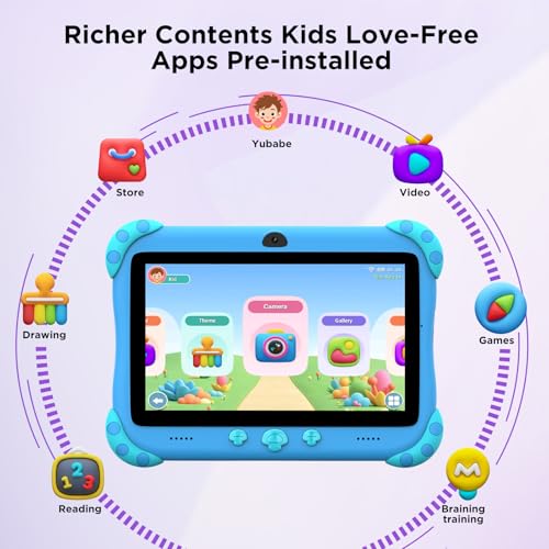 - 【Newest Version Kids Tablet】Multi-Functional 7 inch kids tablets is the latest product comes with GMS certified Yubabe kids Apps Pre loaded, This tablet for kids equiped with Android OS, Quad-Core processor, 2GB RAM, 32GB ROM( Expanded up to128GB), Best kid-friendly companion, Inspire kids learning ,imagination and creativity.