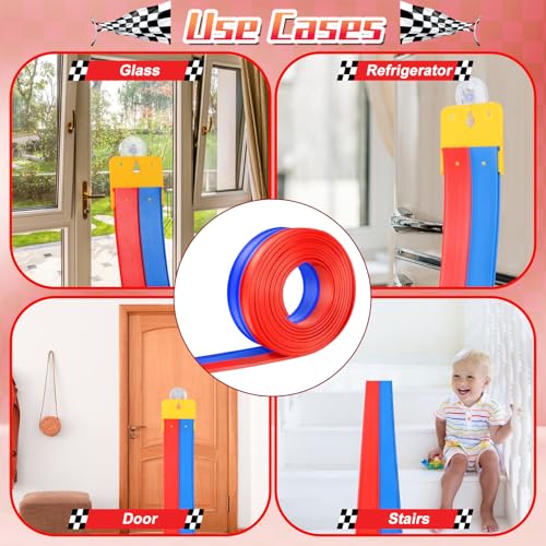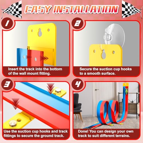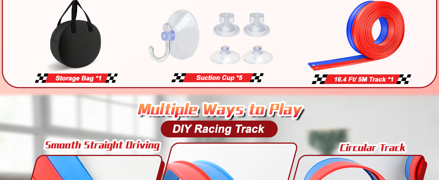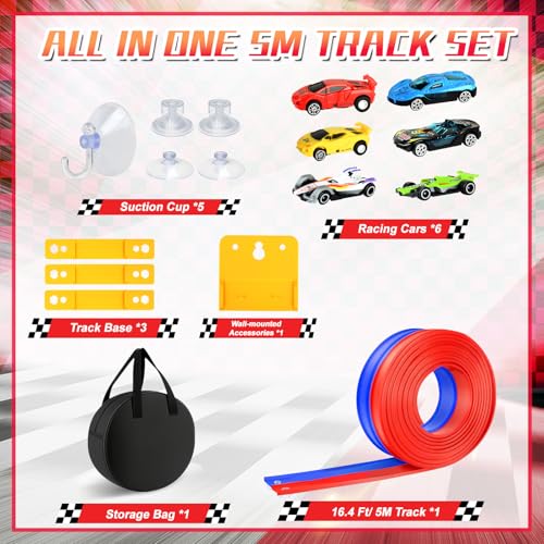 Ready to Play Out of the Box: The set includes 6 toy cars and fixing accessories. Simply attach the suction cups to any smooth surface, unfold the track, and start playing. Enjoy the thrill of racing.