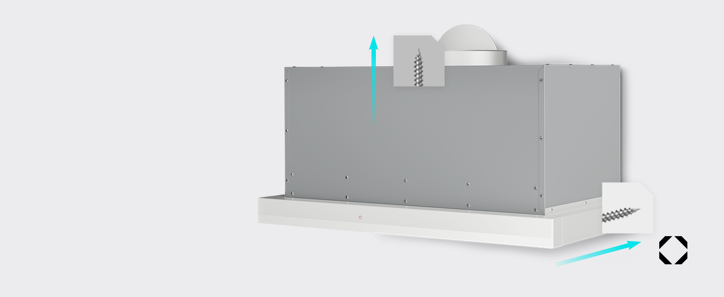 In the box: extractor hood, two activated carbon filters, two non-return flaps, mounting material, multilingual user manual.