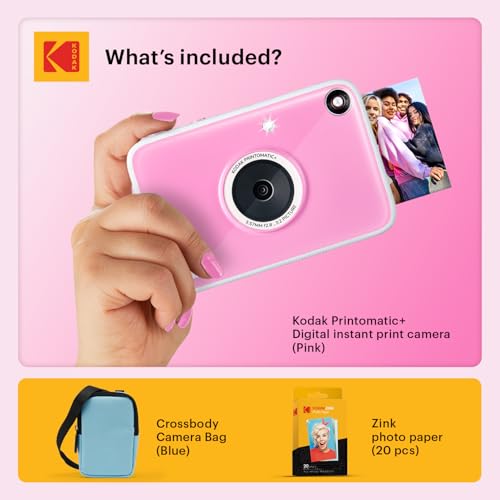 KODAK Printomatic+ Instant Print Digital Camera Starter Bundle + Carrying Case (Blue) + Zink 20pk Sticky-Back Photo Paper – 10MP, Full-Color Photos, GB LED Status Indicator – Pink