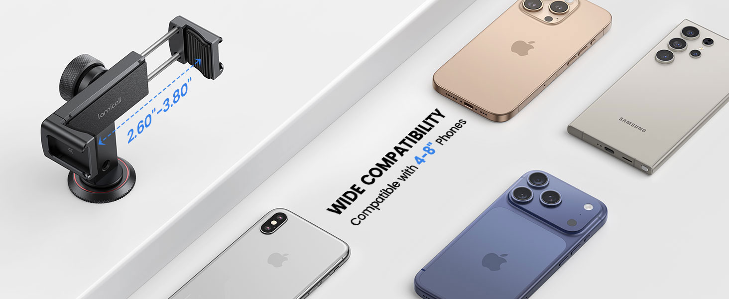- 【Universal Phone Clamp】Our phone clamp has an adjustable width of 2.52"-3.58" (64-91mm) and a thickness of 20 mm. Just turn the back locking knob to lock or unlock it. It's compatible with 4-8 inch phones with thick cases, such as iPhone 17 Air 16e 16 15 Plus Pro Pro Max/14 Plus Pro Pro Max/13 mini Pro Pro Max/12 mini Pro Max/11/XR/XS Max/XS/8/7/6/5/4/SE (3rd generation); Xperia 1/5 Ⅴ/ Z4/Z5; Galaxy S24/S25/Ultra/Note 10+/20/Z Fold/edge/A9S/A70/W26 Flip and other models.