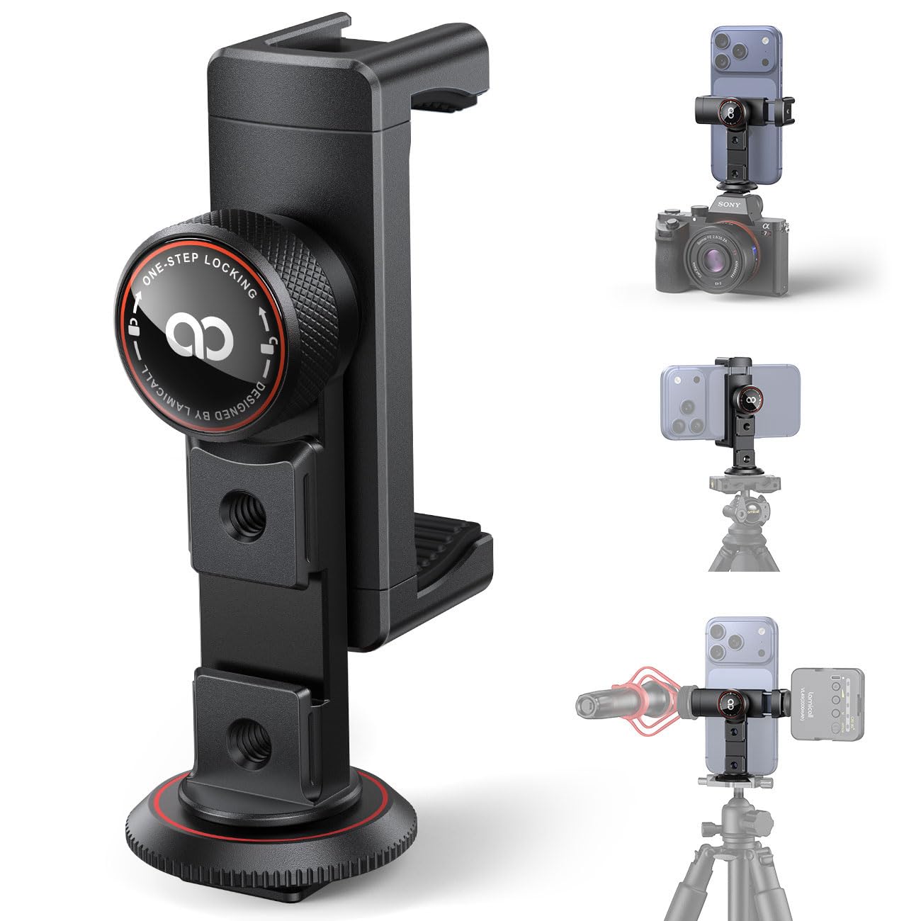 - 【Multi-Functional Holder】The phone tripod mount features 2 1/4" screw holes and 3 cold shoe mounts, offering exceptional expandability. It can accommodate LED lights, microphones, magic arms, stabilisers, and various accessory mounts. When fitted with a microphone, the cold shoe mount delivers clear audio capture, maintaining crisp sound quality even in strong wind conditions. This meets all-scenario demands for video recording, vlogging, live streaming, Zoom meetings, and more.