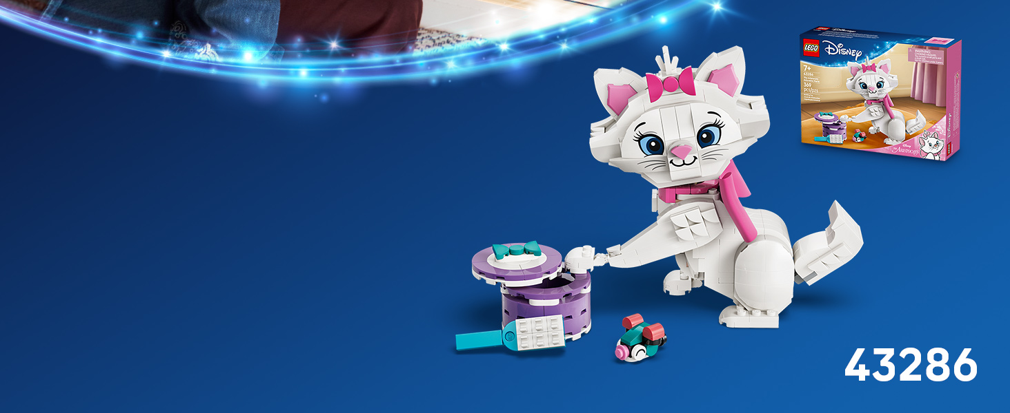 369-piece, 7+ building set (sold separately) with a brick-built posable toy cat, gift box with interchangeable bows, a textile bow for Marie’s collar and more.