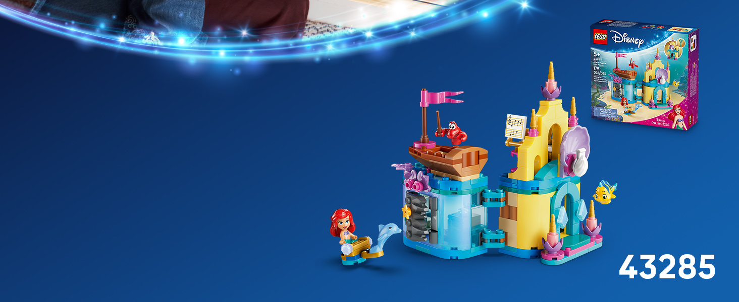 A 179-piece, 5+ building set (sold separately) with a locking playset that opens onto a palace and grotto, plus 3 LEGO | Disney Princess characters and more.