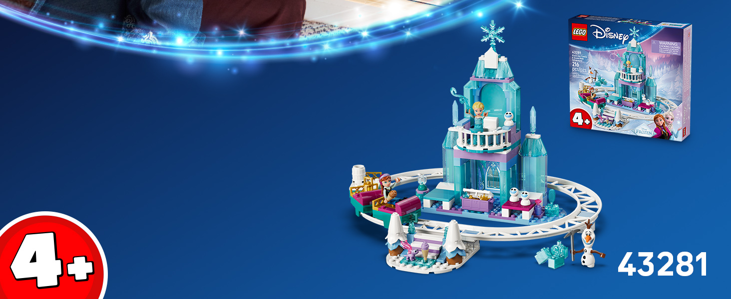 A 216-piece, 4+ building set (sold separately) with a 2-level castle and separate track with 3 sleigh carts, plus 7 LEGO | Disney Frozen characters and more.