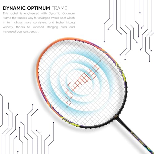 Dynamic Optimum Frame Technology: The racket features Dynamic Optimum Frame technology, which enlarges the sweet spot. This innovation results in a more consistent and higher hitting velocity by widening the stringing area and increasing bounce strength. These enhancements contribute to improved shot accuracy and power, enhancing overall performance on the badminton court.