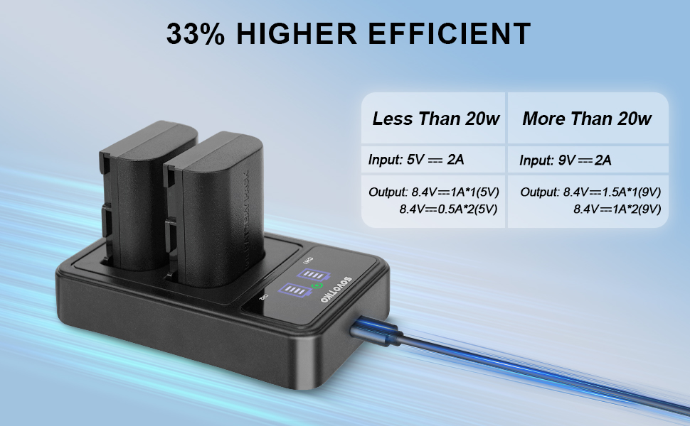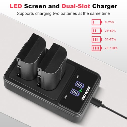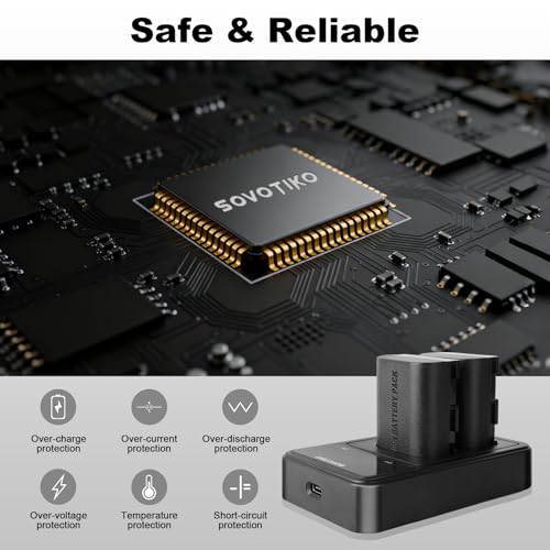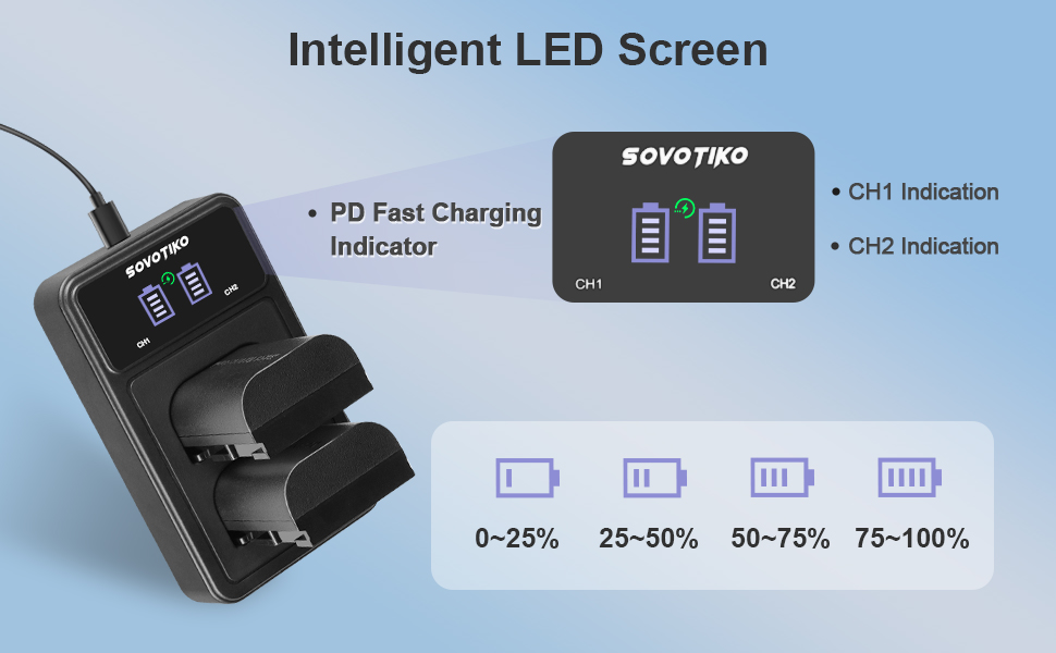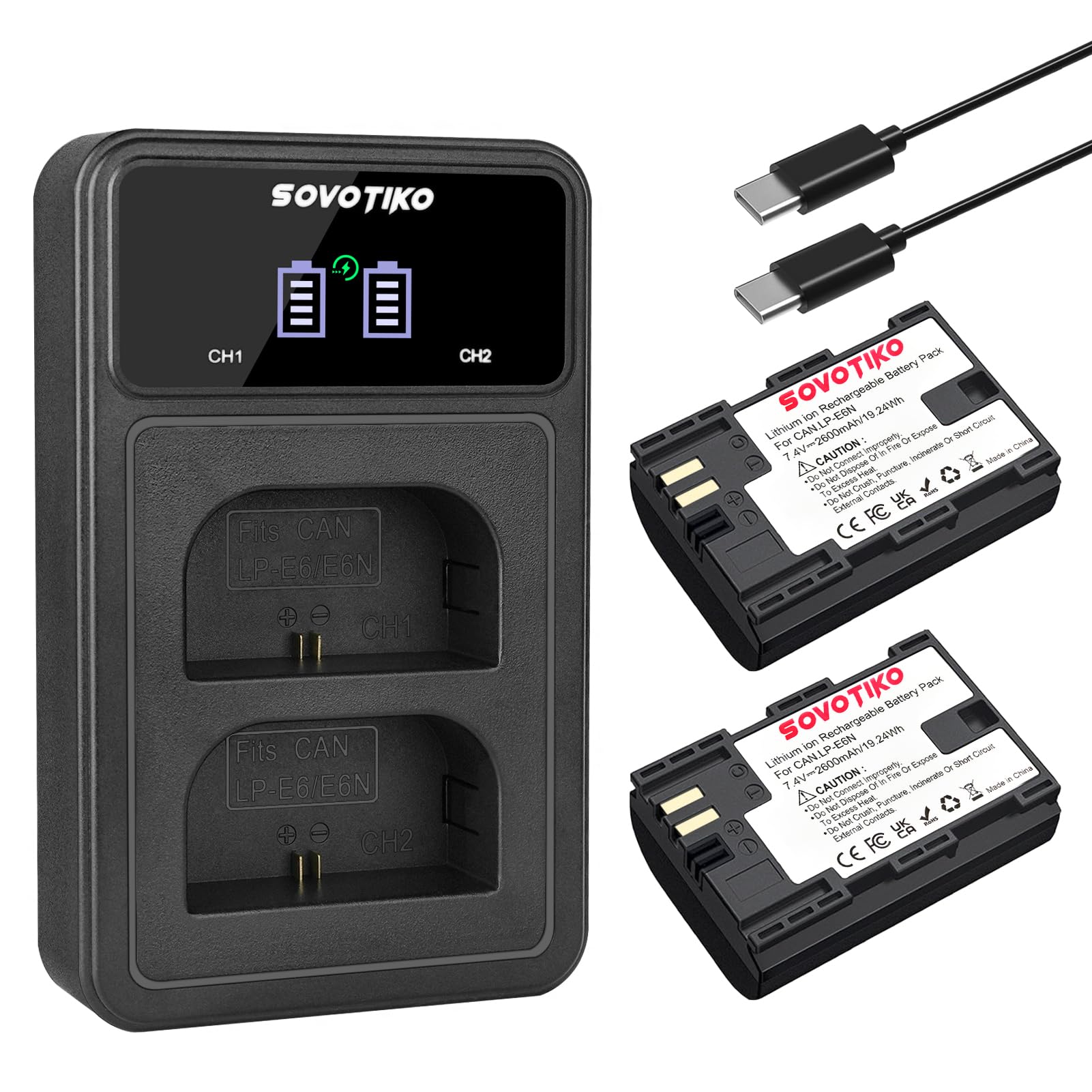- PD Fast Charging And Dual Slot Charger Design: The SOVOTIKO LP-E6N battery charger has a USB-C port that supports the PD protocol. When your adapter power is greater than 20w, you can unlock faster charging speeds. In addition, the dual-slot design allows you to charge two batteries at the same time.