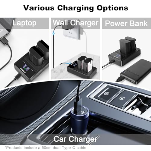 - Various Charging Options: The LP-E6N battery charger has a built-in Type-C connector. Both connectors of our charging cable can be used to charge the camera battery. You can use any 5V charger to charge the battery. This can be a wall charger, power bank, laptop, or car adapter.