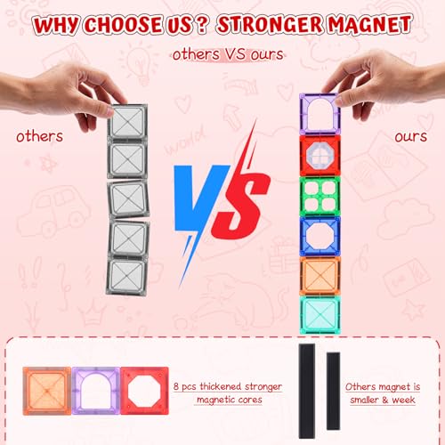 Safe & High Quality:These magnetic tiles are made of safe and durable Food-grade ABS plastic. Every magnetic blocks has 8 features strong magnets that hold firm while building. A smooth surface and rounded-edge design won't scratch or hurt little hands, and the blocks are brightly coloured and do not lose their colour.