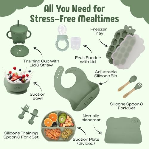 Complete Baby Weaning Set (14pcs) – Includes suction plate, bowl, bib, training cup, straw, spoon & fork, placemat, fruit feeder and freezer tray – all the essentials for a smooth weaning journey.
