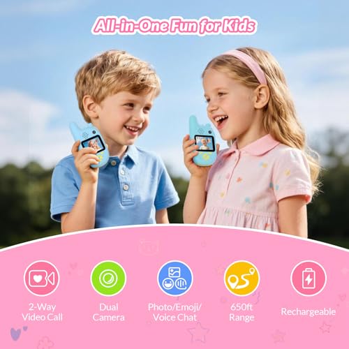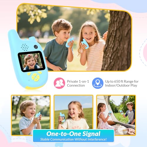 - 【Fun Indoor and Outdoor Toys for Kids]】This video walkie-talkie boasts crystal-clear audio quality, with an indoor communication range of up to 300 feet (approximately 100metres) and an extended outdoor range of 650 feet (approximately 200 metres), ensuring children can stay in touch seamlessly while playing.