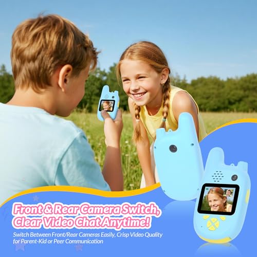 - 【Video walkie talkies for kids】 The Video Walkie Talkies for Kids feature a 2.0-inch screen with both front and rear cameras, enabling real-time video switching, photo capturing, and fun selfies to enhance your child's communication experience.