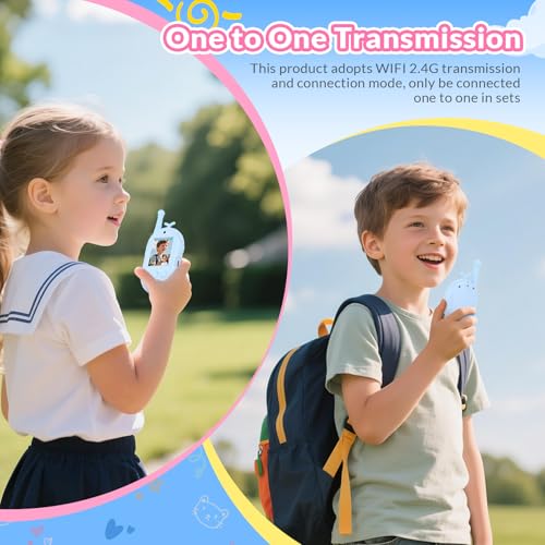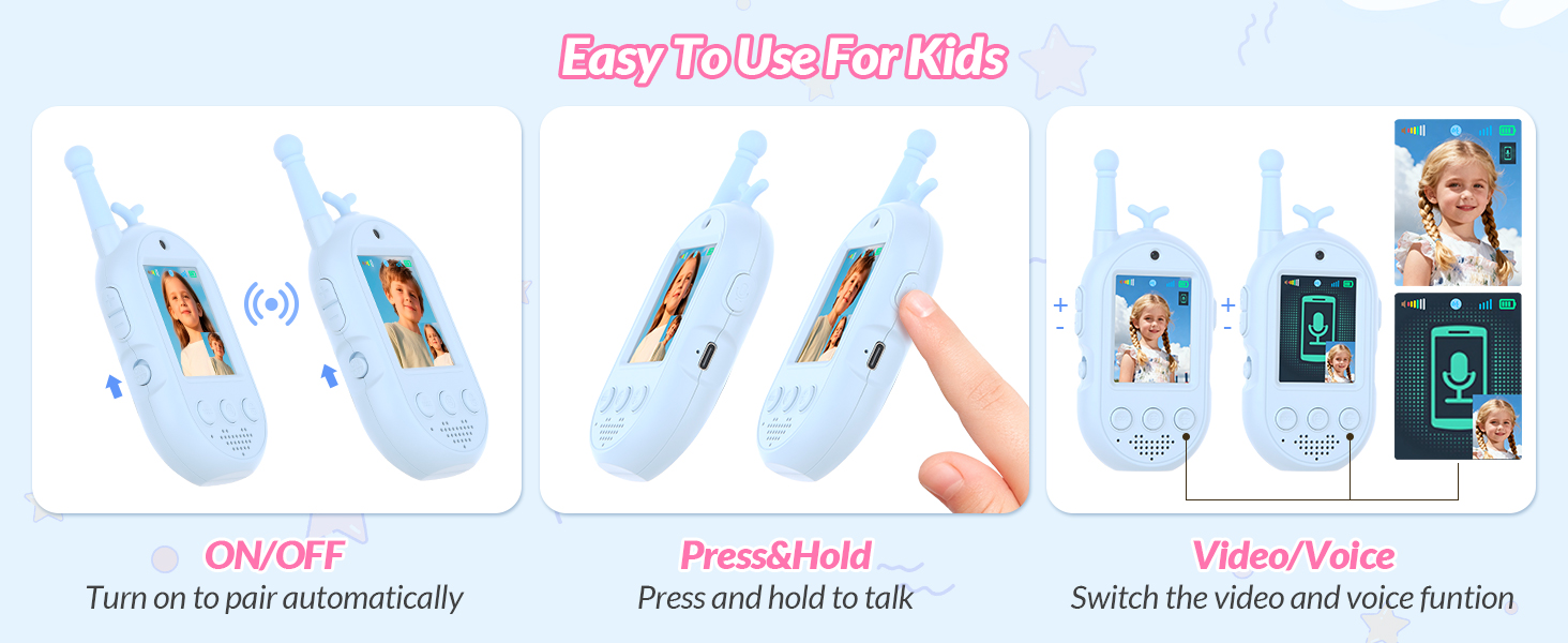 - 【ONE-button talking】The simplest kids Video Walkie Talkies, all your kids need to do is powering on them, Simply press the "SPEAK" button to talk and release to send message. 【One to One Transmission】Adopts Wifi 2.4G transmission and connection mode.