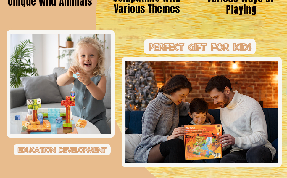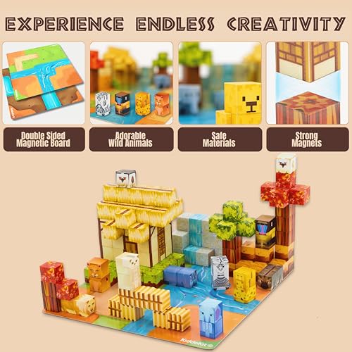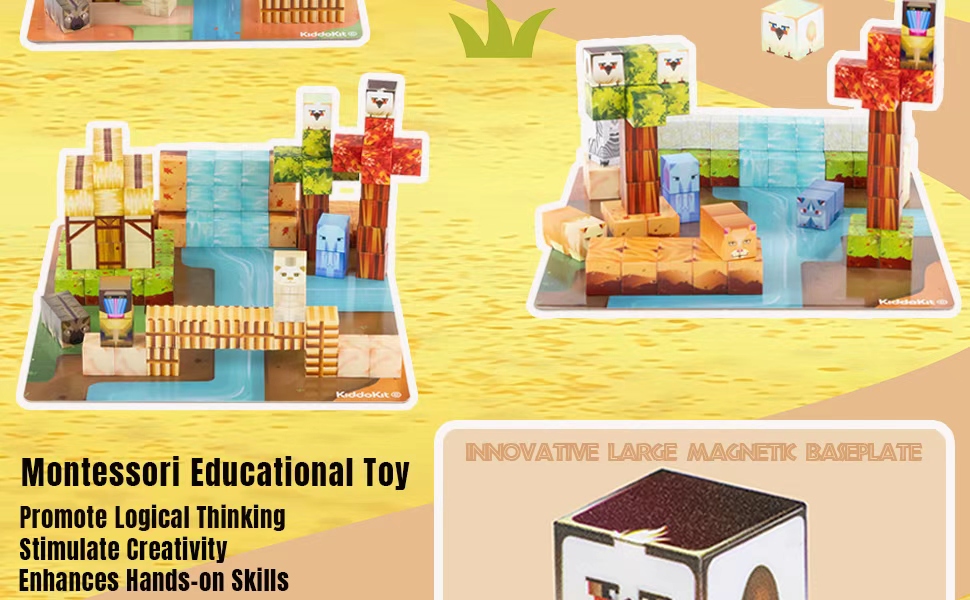 - 1 Double-Sided Magnetic Board – 2 Marvellous Savannah Scenes: Unlike ordinary magnetic sets, our additional strong magnetic boards enhance stability, transportability and structure, ensuring blocks attach securely, which boosts children's confidence. Kiddokit's magnetic boards turn playtime into an epic safari across African golden grasses and lush jungle! They offer immersive front and back landscapes with vibrant colours, letting imagination roam free to create great stories!