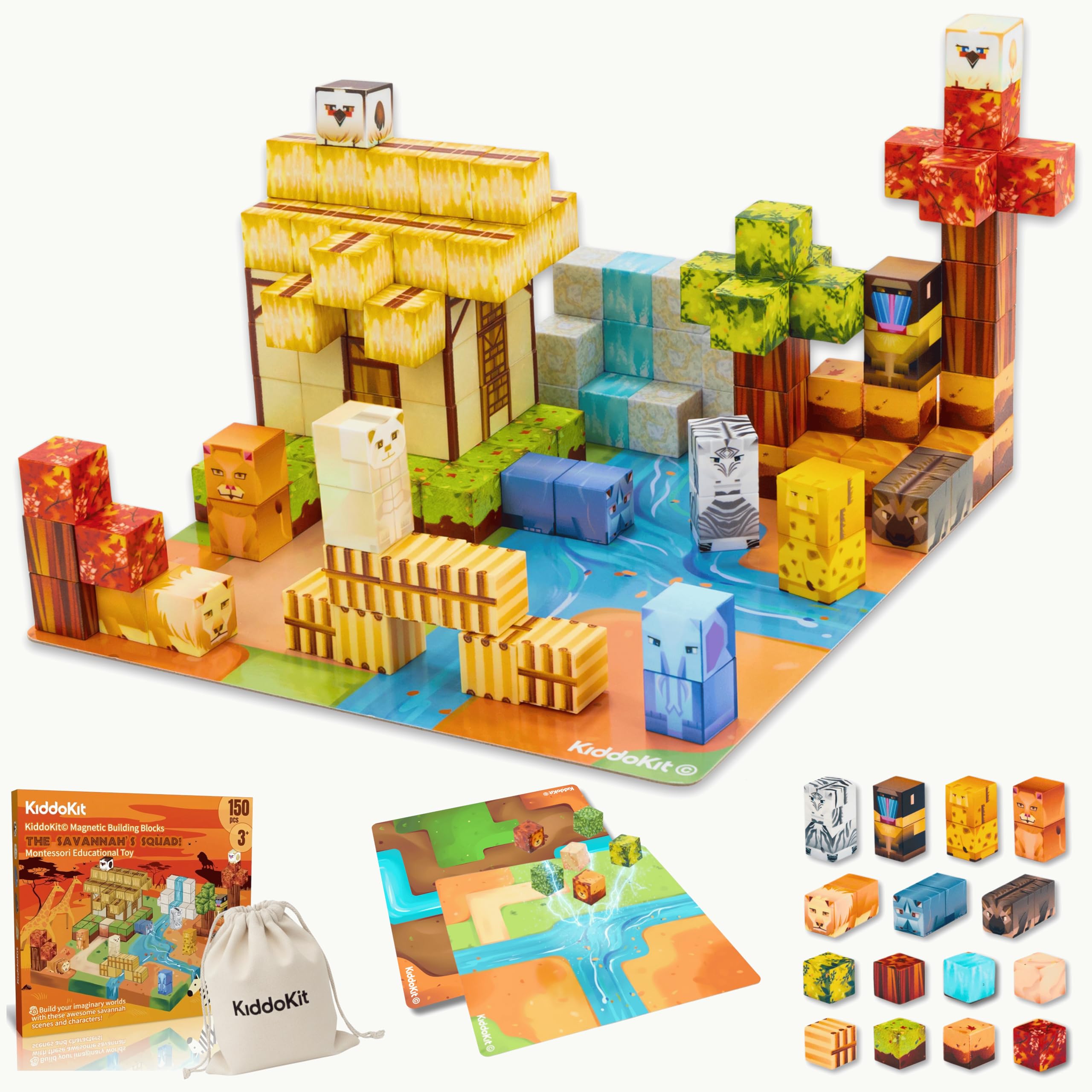 Magnetic Building Blocks Savannah Squad – 150 Terrain & Animals Cubes + 1 Double-Sided Magnetic Board | Montessori Educational Construction Toy for Boys & Girls Age 3+ | STEM Sensory Gif