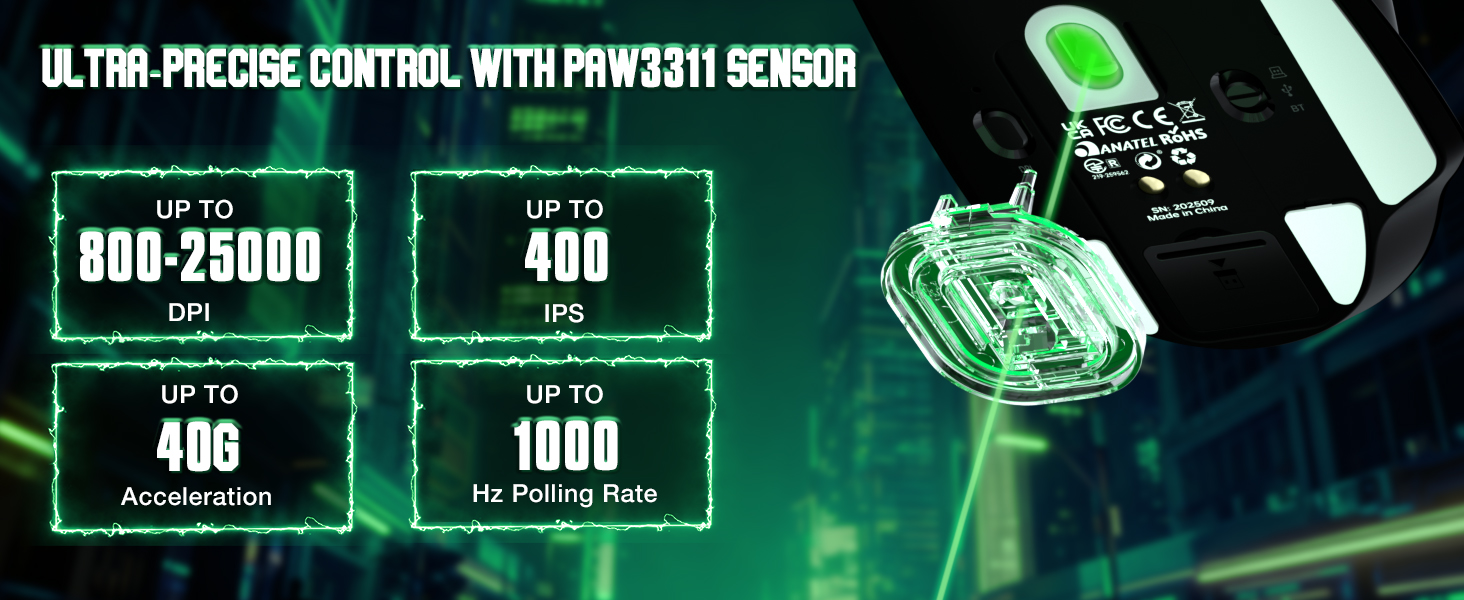 【PAW3311 Gaming Sensor & BK52820 Chip】 Featuring the advanced PixArt PAW3311 sensor with a DPI range of 800 to 25,000, 400 IPS tracking speed, and 40G acceleration, the professional gaming mouse delivers flawless tracking for FPS, MOBA, and competitive esports titles. Powered by the Broadcom BK52820 chipset, it guarantees ultra-low latency wireless performance and stable connectivity for desktop and laptop setups.