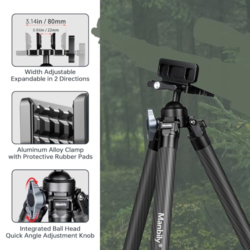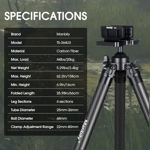 - [Carbon Fiber Tripod] : This Manbily TS-364U3 shooting tripod is made of 8-layer carbon fibre, making it strong and stable. With a max tube diameter of 36mm, it offers unparalleled stability. Includes a 44mm ball and supports a max load capacity of 20kg (44 lbs). Providing smooth 360° horizontal rotation for versatile shooting angles.