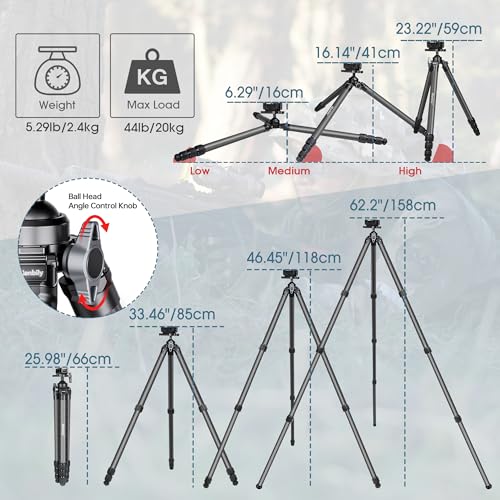 - [Professional Shooting Tripod] : It uses quarter-turn twist locks that extend to a maximum height of 62.2 inches or collapse the legs quickly. Three variable leg angles accommodate uneven terrain and allow shooting at a minimum height of 6.9 inches. The rubber feet can be replaced with metal spikes.