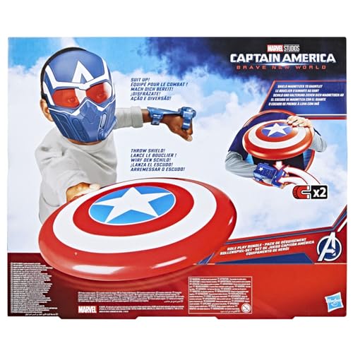The ultimate Marvel play experience is here with the Captain America Role-Play Bundle toy set! This role-play bundle includes a mask, shield, and gauntlet, so kids can imagine suiting up for battle as Sam Wilson. Throw the shield at the bad guys just like Cap! The shield also magnetizes to the gauntlet, so boys and girls can wear it on their wrist and pretend to deflect imaginary attacks! Both the mask and gauntlet feature adjustable straps and fit most kids ages 5 and up. Role-play toys can double as awesome accessories to Captain America costumes when dressing up for playtime, Halloween, or Super Hero themed parties! Look other Marvel role-play toys, figures, and vehicles for even more superpowered action! (Each sold separately. Subject to availability.) Copyright MARVEL. All trademarks and registered trademarks are the property of their respective owners. HASBRO and all related trademarks and logos are trademarks of Hasbro, Inc.