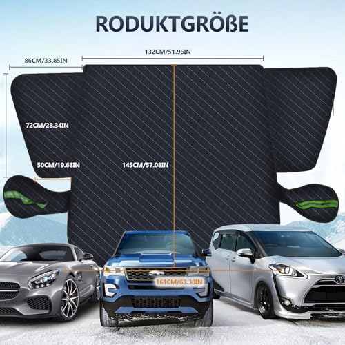 【More Protection for Your Car】The dimensions of the winter windshield cover are 218 x 161 x 145 cm (86 x 63 x 57 inches). The car windshield cover covers a larger area than other products and can better protect the windshield, side windows, door handles, wipers, and mirrors. Fully compatible with most cars and SUVs.